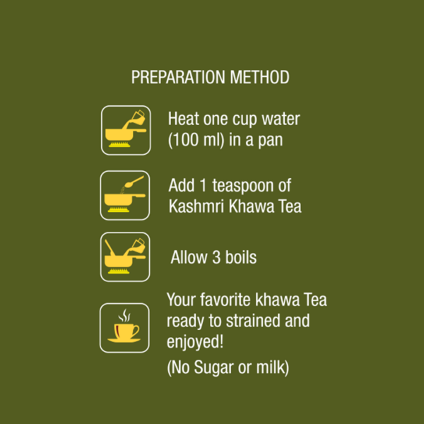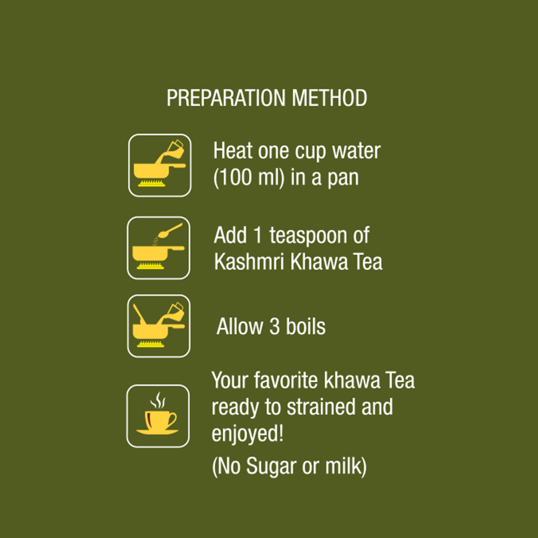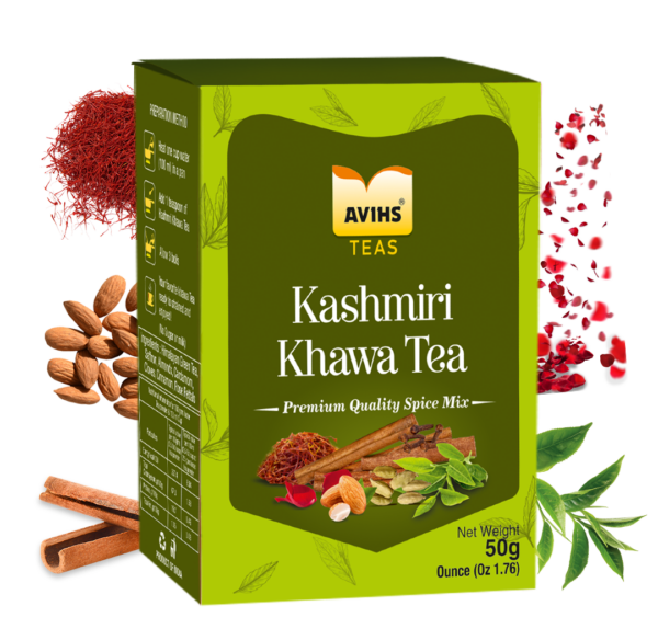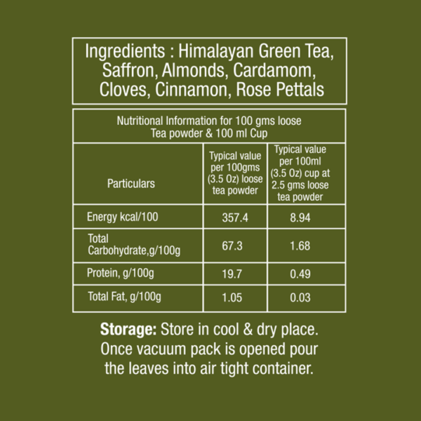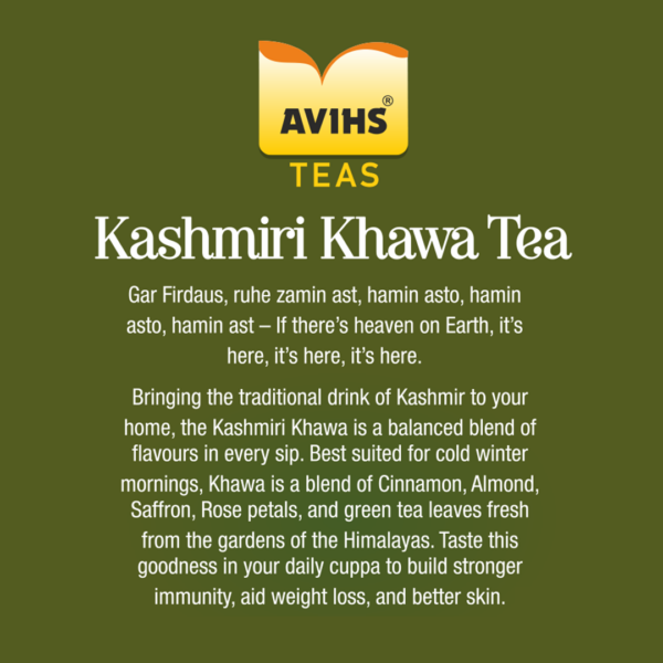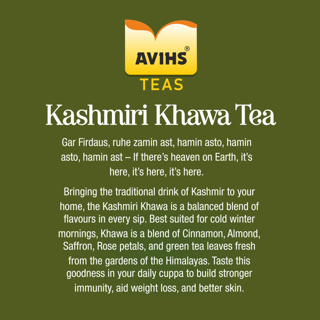 | Content | Bringing the traditional drink of Kashmir to your home, the Kashmiri Kahwa is a balanced blend of flavours in every sip. Best suited for cold winter mornings, Kahwa is a blend of cinnamon, almond, saffron, rose petals, and green tea leaves fresh from the gardens of the Himalayas. Taste this goodness in your daily cuppa to build stronger immunity, aid weight loss, and better skin.